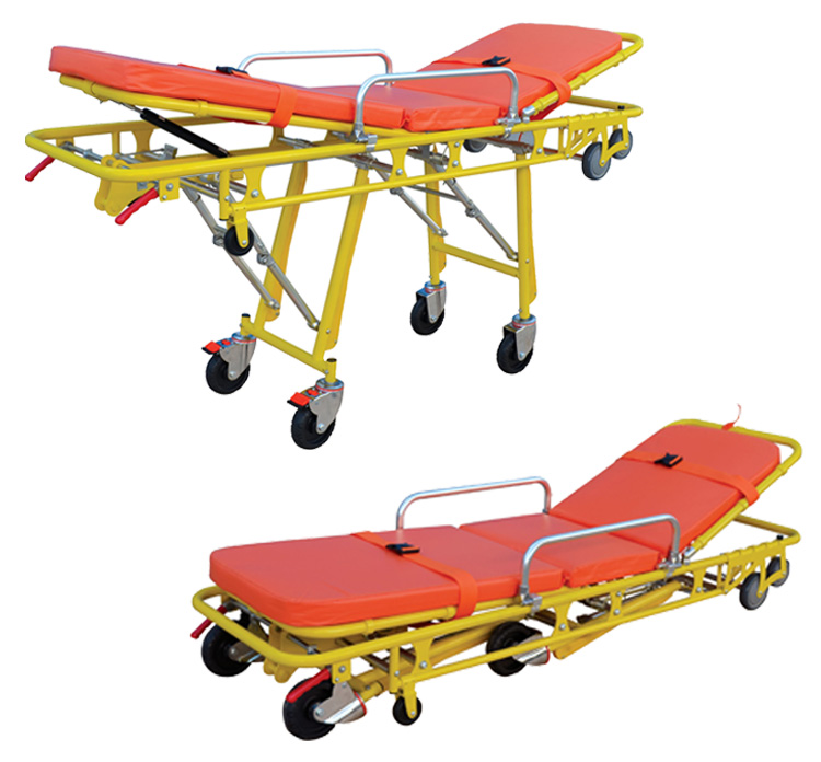 擔(dān)架主體采用鋼制結(jié)構(gòu)。采用海綿軟墊,使傷病員躺臥舒適。折腿機(jī)械結(jié)構(gòu),通過左右手柄控制,僅需一名救護(hù)人員把病人推上救護(hù)車。