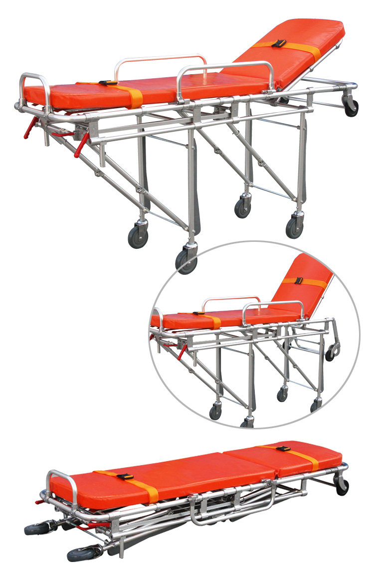 采用高質(zhì)鋁合金材料,采用海綿軟墊,使傷病員躺臥舒適,折腿機(jī)械結(jié)構(gòu),通過左右手柄控制。僅需一名救護(hù)人員把病人推上救護(hù)車。固定支架與救護(hù)車相固定,擔(dān)架通過滑道上車后可鎖定,前導(dǎo)輪架可折疊,適合在狹窄的空間救護(hù)病人,例(電梯)。