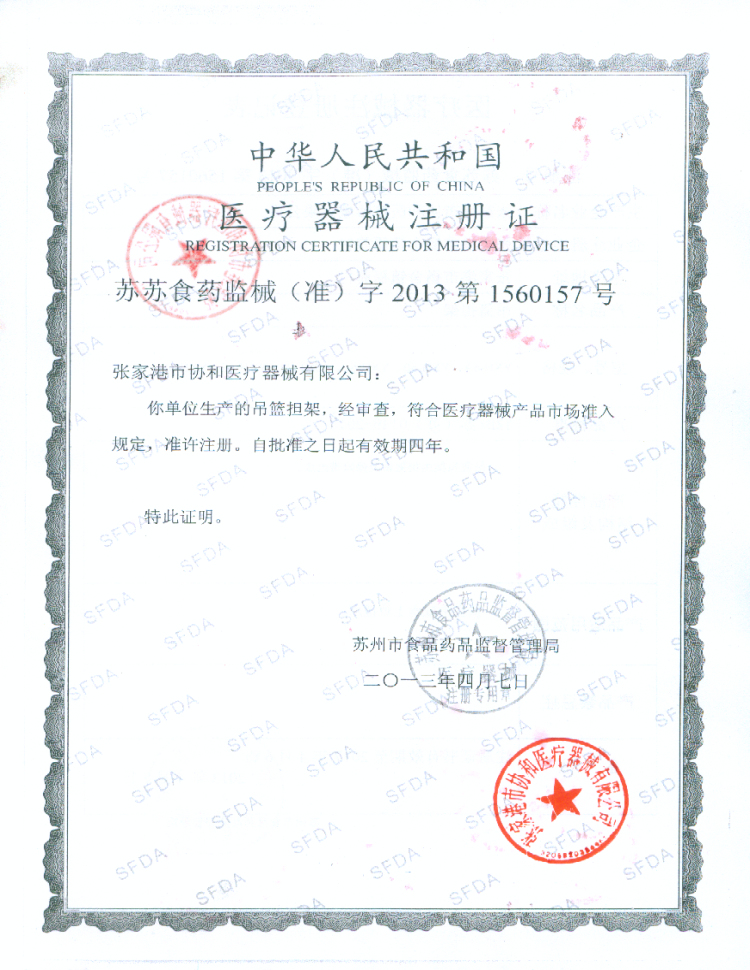 吊籃擔(dān)架注冊證