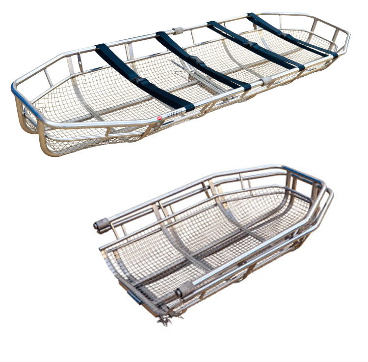 此擔架的構造著眼于急救的特殊性,如崎嶇的山區(qū)、空中或海上救援,框架堅固耐用,簡便可靠的裝置讓操作人員能夠安全快捷的采取急救措施。鉤懸能與飛機上掛鉤連接,實現(xiàn)野外救援。擔架配有安全帶和墊子。由不銹鋼管和網(wǎng)制成,不會對病人造成另外的傷害,比普通擔架更牢固,可與板式擔架一起使用。可分成兩部分,易運輸和儲存。