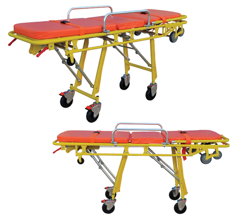 擔(dān)架主體采用鋼制結(jié)構(gòu)。采用海綿軟墊,使傷病員躺臥舒適。折腿機(jī)械結(jié)構(gòu),通過左右手柄控制,僅需一名救護(hù)人員把病人推上救護(hù)車。